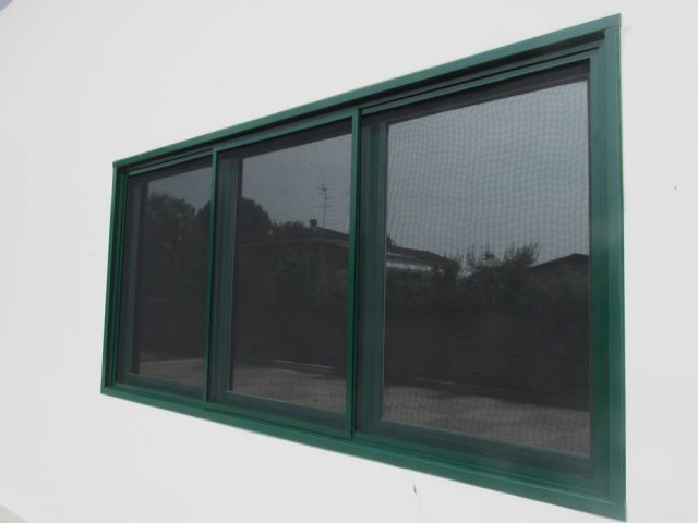 Zanzariera con telaio in alluminio a più pannelli (da 1 a 4) montati su guide a scorrimento orizzontale per portefinestre e verticale per finestre.